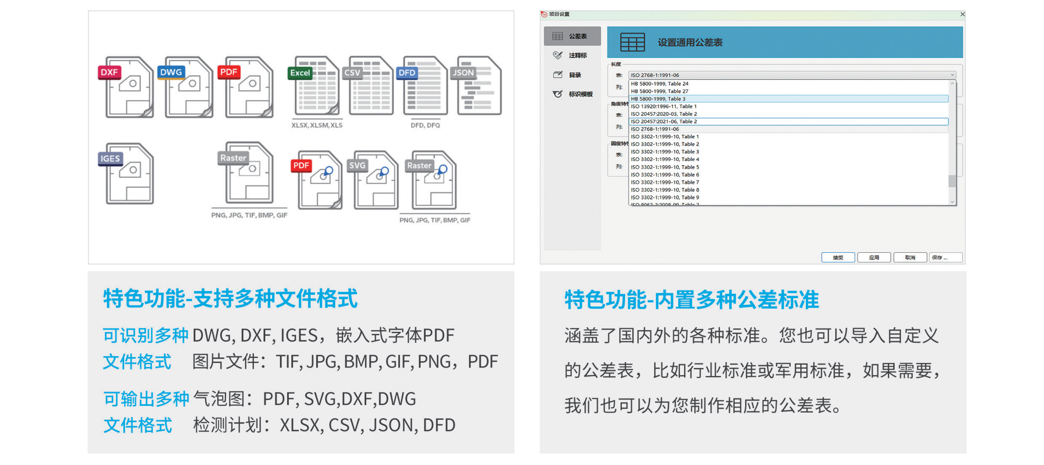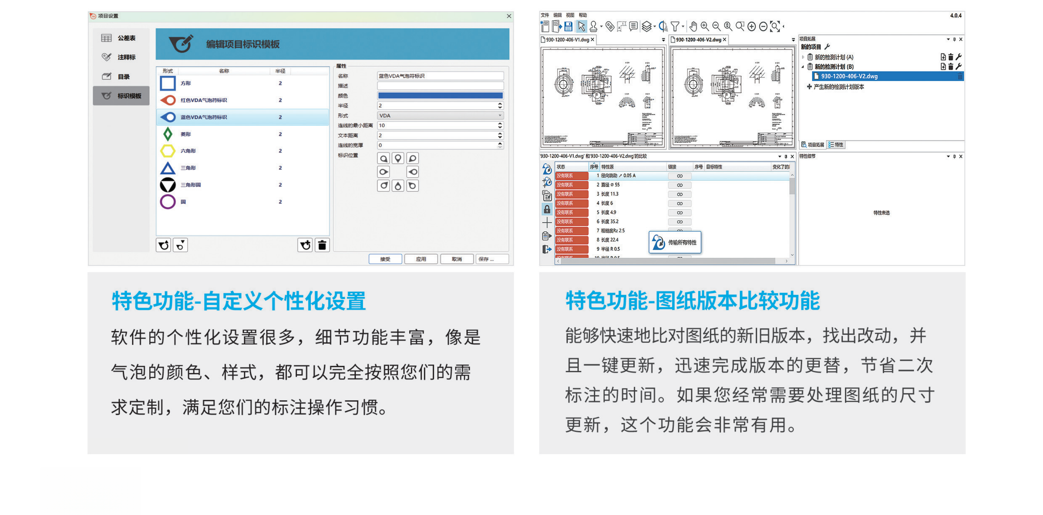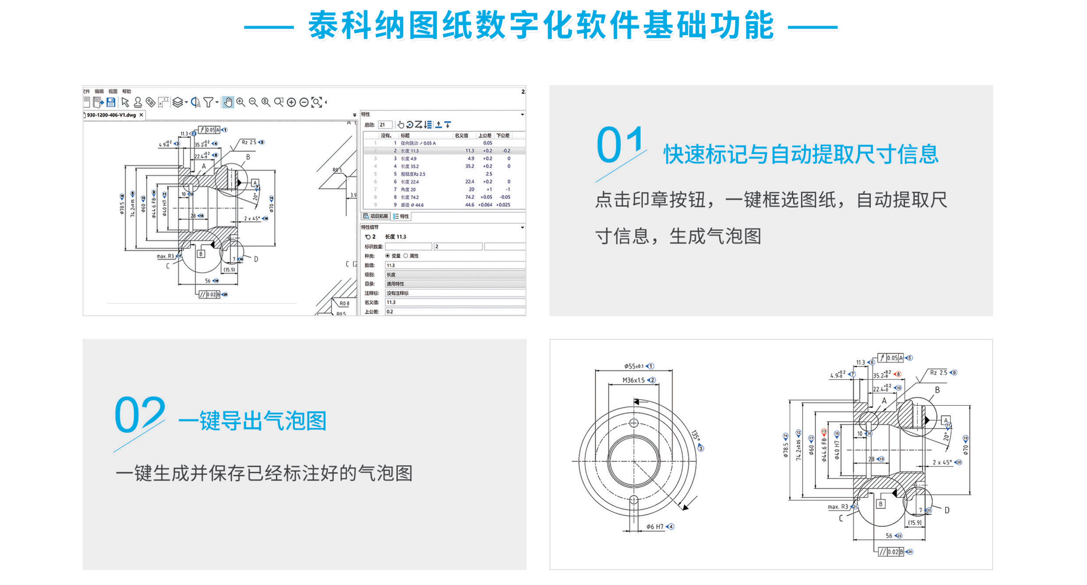 一鍵識別圖紙尺寸,自動生成氣泡圖,一鍵導出氣泡圖和檢(jiǎn)測計劃。德國精研30年(nián)的圖紙數字化軟件,符合國際質量管理(lǐ)體係(xì),可以識別DWG,DXF,PDF及各種圖片格式的圖紙的尺寸公差。還有新舊圖紙版本(běn)比較功能(néng),免去二次標注的煩惱。同時能夠添加量具,與蔡司三坐標進行聯動,形成圖紙(zhǐ)檢測的全自動閉環,助力製造業數字化轉型。