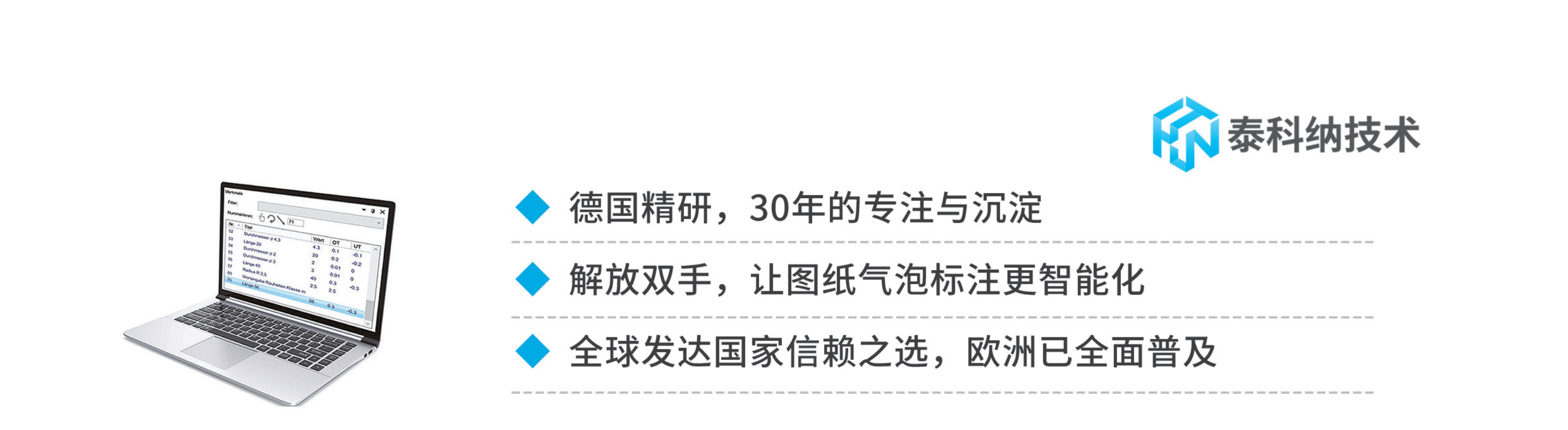 泰(tài)科(kē)納圖紙數字化(huà)軟件源自德國,擁有30年(nián)專注於圖紙氣泡圖標注智能化的深厚積累(lèi),在德國和歐洲已經普及,成為(wéi)馬爾、蔡司、西門子等國際大廠的標準配置。深(shēn)受奔(bēn)馳(chí)寶馬、奧迪等(děng)知(zhī)名車企信賴(lài),在歐(ōu)洲乃至全球(qiú)範圍內(nèi)占(zhàn)據不可替代(dài)的行業地位。