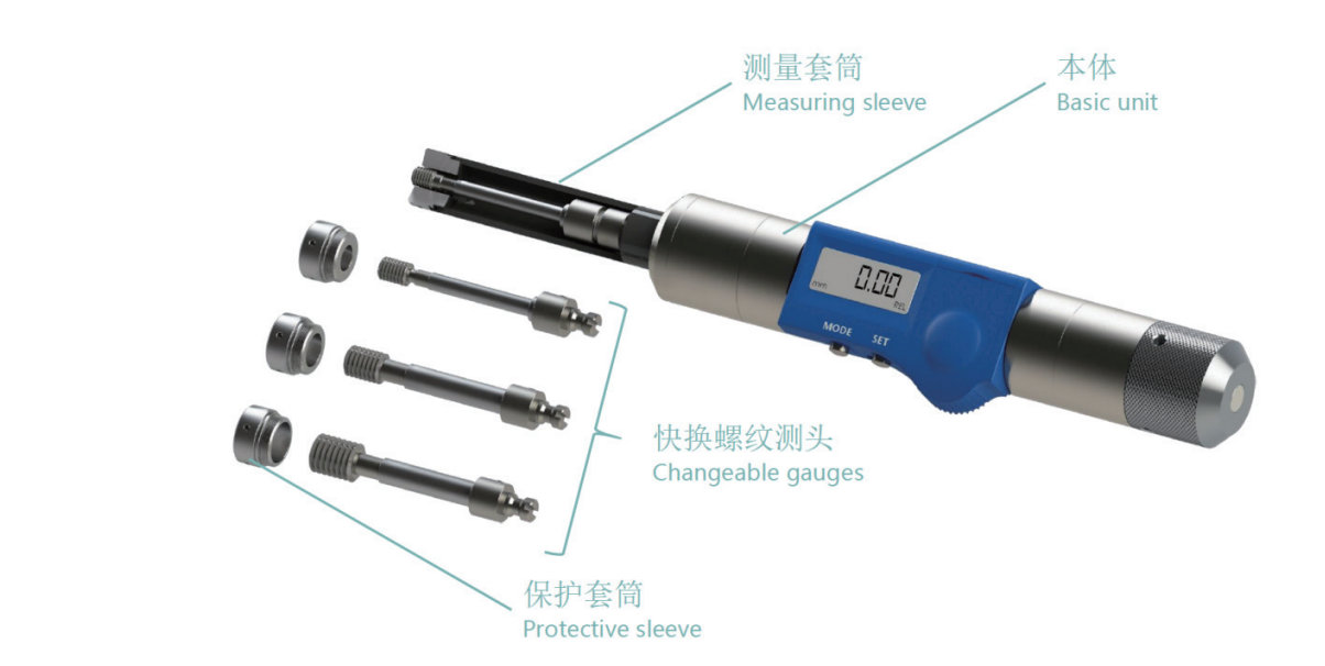 可快(kuài)速更換螺紋塞規測頭,用於測量不同螺紋規格通端的深度。